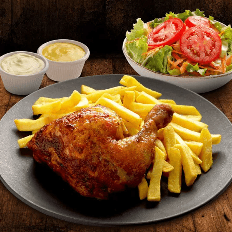 Cocinado lentamente al carbón, el pollo alcanza ese punto perfecto en el que la piel queda crujiente y dorada, mientras la carne permanece tierna, jugosa y llena de sabor. Es la porción perfecta para disfrutar una comida completa sin excesos, con todo el gusto de la brasa tradicional peruana.
